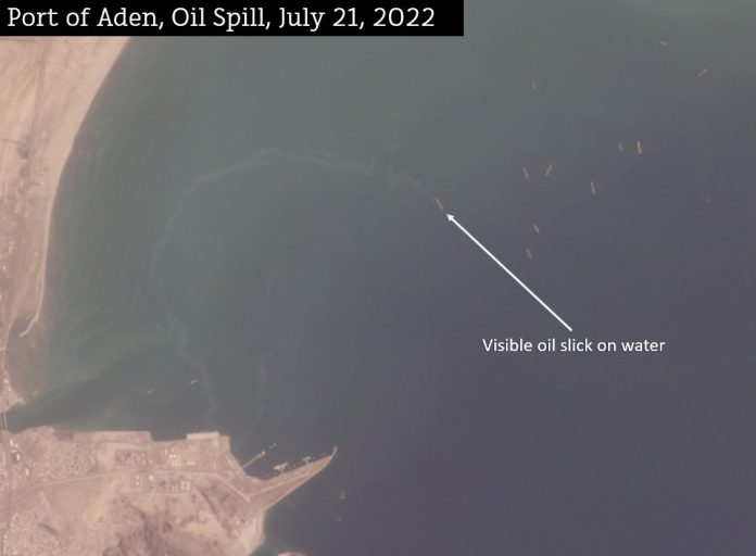 وفي 22 يوليو، كشفت سلسلة تغريدات [2] نشرها رئيس مشروع نزع السلاح الإنساني لمنظمة السلام الهولندية PAX، وين زويننبرج، عبر حسابه الشخصي في تويتر، التسرب النفطي قُبالة ميناء عدن جنوبي اليمن، مُدعماً بصور عبر الأقمار الصناعية، التقطتها محطات تصوير الفضاء الأوروبي.